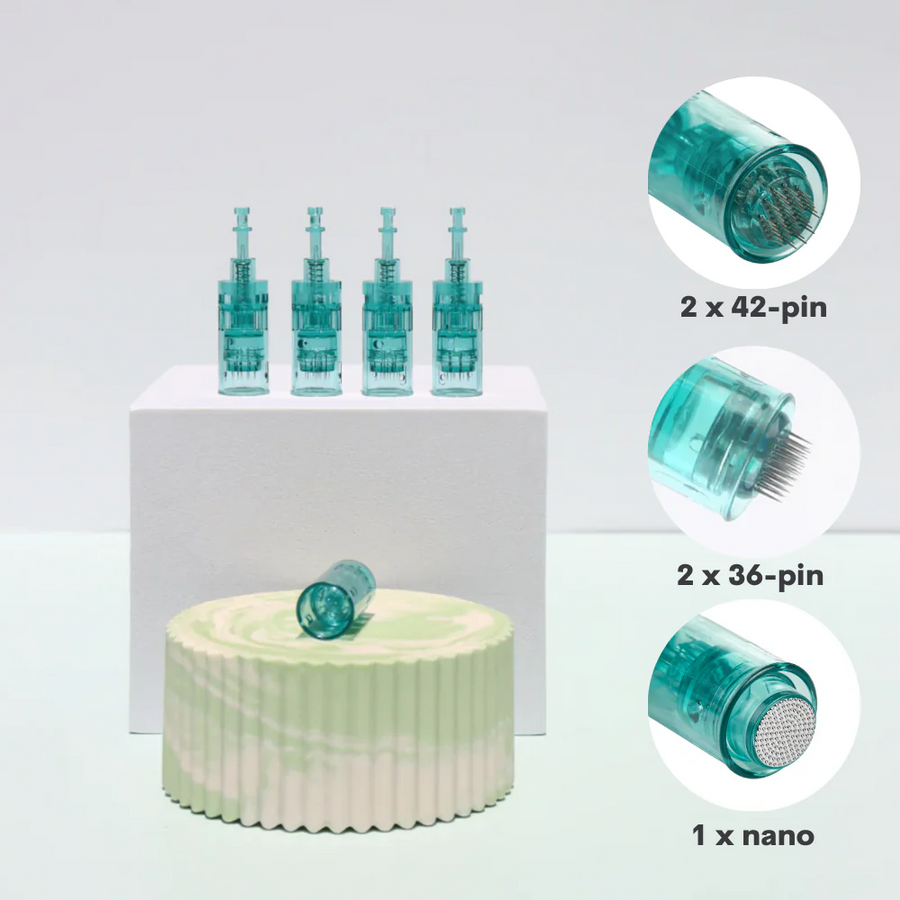 Each cartridge in our combo pack aids in supporting the skin's natural collagen production and diminishing signs of aging, scarring, pigmentation, and more.